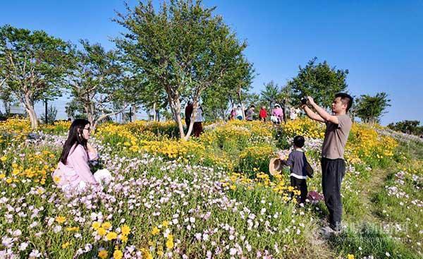 日前,市民在位于宿城新汴河北堤路的宿州中華珍奇紫薇文化園里賞花。初夏時節(jié),紫薇園里的月見草、金雞菊等各色花卉競相綻放,形成一片花的海洋,吸引眾多市民前往拍照打卡。 記者 馬峰 攝