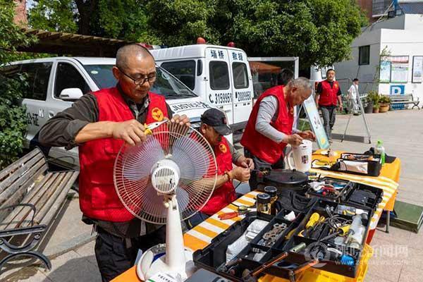 5月18日上午,埇橋區(qū)南關(guān)街道九中社區(qū),志愿者在為居民修理小家電。當(dāng)天,由市委宣傳部(市文明辦)組織的“鄰里集市”來到九中社區(qū),現(xiàn)場設(shè)置了義務(wù)理發(fā)、健康義診、舊衣縫補、家電維修等20余個便民服務(wù)攤位以及非遺展示展臺,吸引眾多居民前來“趕集”。 記者 蔣幫煜 攝