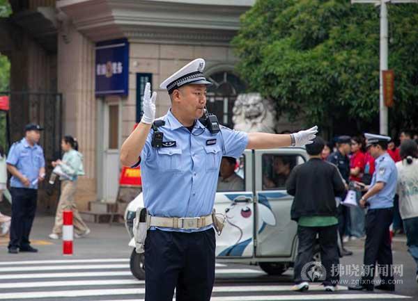 交警在宿城第一初級(jí)中學(xué)考點(diǎn)外維持交通秩序。