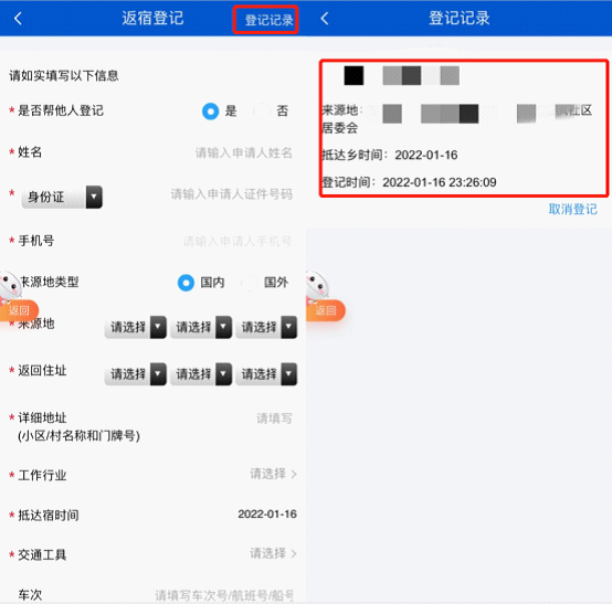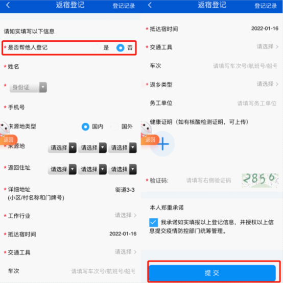 按照提示的類型進行登記,登記后點擊提交即可。且無論是自己登記還是幫別人登記,都可在右上角登記記錄里查詢登記詳情。
