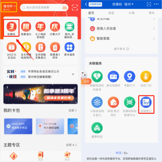 打開皖事通APP,選擇宿州市,點擊“安康碼”或搜索“安康碼”服務點開,下拉相關聯(lián)功能,即可看到“返宿登記”服務,點擊即可進入。如下圖操作所示: