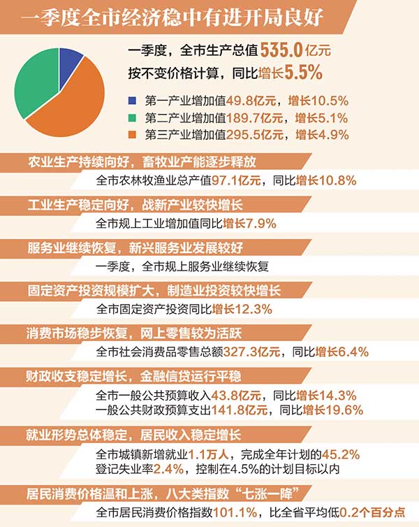根據(jù)地區(qū)生產(chǎn)總值統(tǒng)一核算結(jié)果,一季度,全市生產(chǎn)總值535.0億元,按不變價格計算,同比增長5.5%。其中,第一產(chǎn)業(yè)增加值49.8億元,增長10.5%;第二產(chǎn)業(yè)增加值189.7億元,增長5.1%;第三產(chǎn)業(yè)增加值295.5億元,增長4.9%。