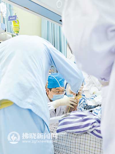 說(shuō)話間,一位患者突然出現(xiàn)血氧飽和度急劇下降,情況危急,顧陳峰和同事們迅速協(xié)助醫(yī)生氣管插管,并準(zhǔn)備呼吸機(jī)等,經(jīng)過(guò)10幾分鐘的搶救,患者轉(zhuǎn)危為安。在ICU里,這樣的場(chǎng)面經(jīng)常在上演,這群白衣天使隨時(shí)在為患者生的希望戰(zhàn)斗。