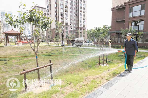 清潔工在大澤園小區(qū)內(nèi)為植被澆灌