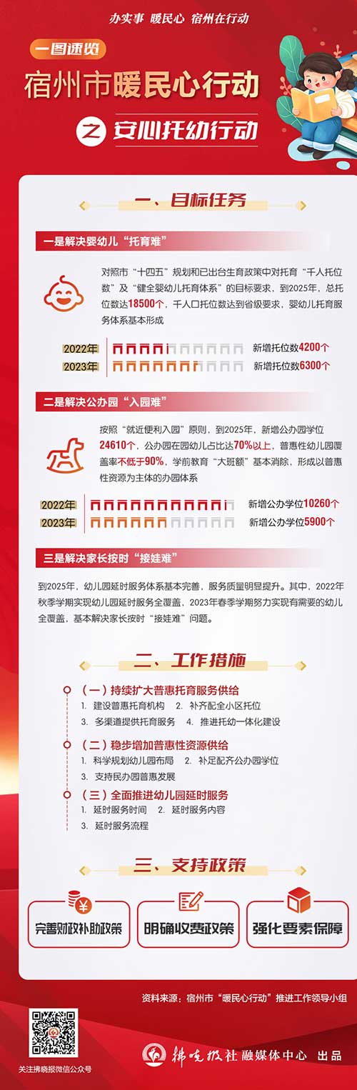 《方案》分別從解決嬰幼兒“托育難”、公辦園“入園難”、家長按時“接娃難”等3個方面明確了目標(biāo)任務(wù)。到2025年,總托位數(shù)達(dá)18500個,千人口托位數(shù)達(dá)到省級要求,嬰幼兒托育服務(wù)體系基本形成。其中,2022年新增托位數(shù)4200個,2023年新增托位數(shù)6300個。按照“就近便利入園”原則,到2025年,新增公辦園學(xué)位24610個,公辦園在園幼兒占比達(dá)70%以上,普惠性幼兒園覆蓋率不低于90%,學(xué)前教育“大班額”基本消除,形成以普惠性資源為主體的辦園體系。2022年新增公辦學(xué)位10260個,2023年新增公辦學(xué)位5900個。到2025年,幼兒園延時服務(wù)體系基本完善,服務(wù)質(zhì)量明顯提升。其中,2022年秋季學(xué)期實現(xiàn)幼兒園延時服務(wù)全覆蓋,2023年春季學(xué)期努力實現(xiàn)有需要的幼兒全覆蓋,基本解決家長按時“接娃難”問題。