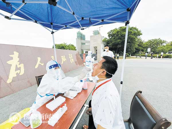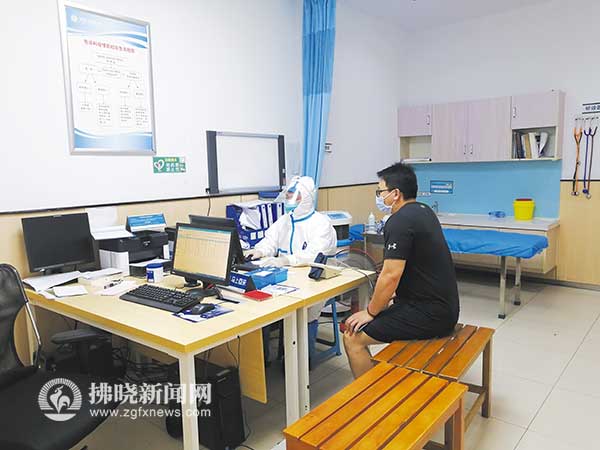 7月6日下午,在泗縣府前廣場核酸采樣點,工作人員正在進行核酸采樣。