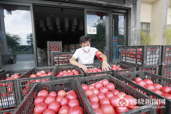 7月7日,在泗縣丹鳳路,當(dāng)?shù)刂驹刚哒诜謷b運(yùn)埇橋區(qū)順河鎮(zhèn)馬場(chǎng)村菜農(nóng)捐贈(zèng)的西紅柿。