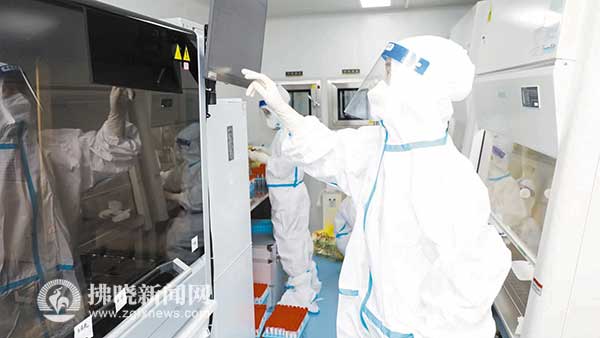 核酸檢測(cè)方艙內(nèi)工作人員操作核酸提取機(jī)