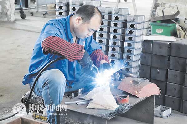 埇橋區(qū)恒泰電氣有限公司電焊職工正在忙生產(chǎn)。 特約攝影 張成伍