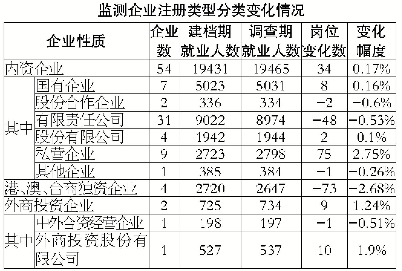 在60戶監(jiān)測企業(yè)中,共有54家內(nèi)資企業(yè)監(jiān)測崗位數(shù)19465人, 比上月末增加34人,增幅0.17%;2家外商投資企業(yè)監(jiān)測崗位數(shù)734人, 比上月末增加9人,增幅1.24%;4家港、澳、臺商獨資企業(yè)監(jiān)測崗位數(shù)2647人,比上月末減少73人,減幅2.68%(見下表)。