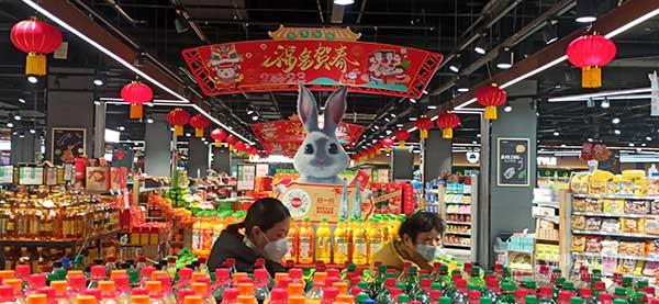 宿城華夏世貿(mào)超市張燈結(jié)彩,開設(shè)了“福兔賀春”年貨大街。 特約攝影 王玉明