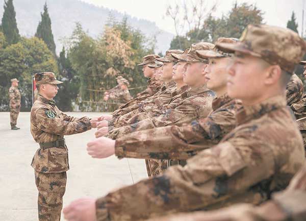 歡送儀式上,身著戎裝的新兵胸戴紅花,身姿挺拔,精神飽滿。