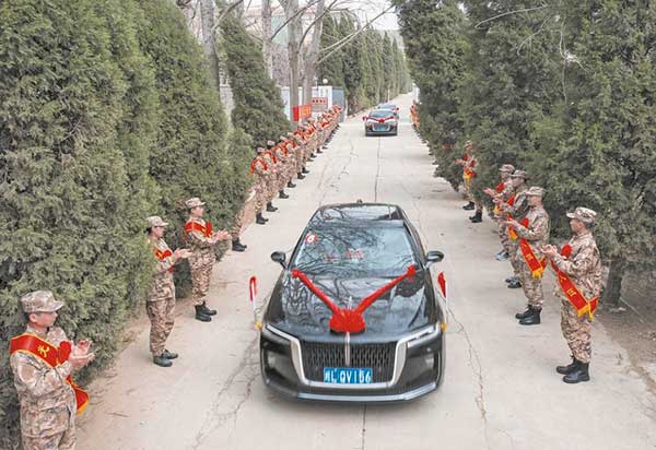由退伍老兵駕駛的紅旗車隊送新兵啟程。