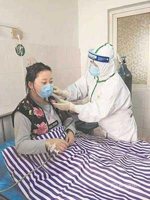 2020年2月2日,護(hù)士長劉湘云為我市第一例新冠肺炎確診患者做心理疏導(dǎo)、協(xié)助更換口罩。