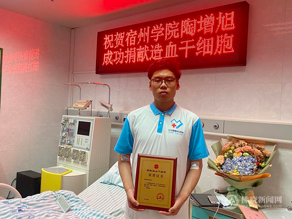 拂曉新聞網(wǎng)--拂曉報(bào)訊 5月22日,宿州學(xué)院學(xué)生陶增旭成功捐獻(xiàn)出166毫升造血干細(xì)胞混懸液,為一名9歲的血液病患者點(diǎn)亮生命之光。他成為我市第35例、宿州學(xué)院第8例造血干細(xì)胞捐獻(xiàn)志愿者。
