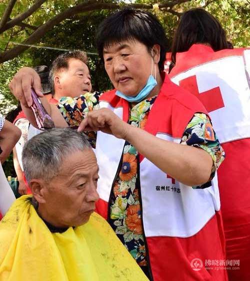 “大姐,您來啦!稍等一會兒,我給這位同志理好后就給您剪?!苯?,在宿城東仙橋公園的小廣場,志愿者陳玲笑著對一位老人說。