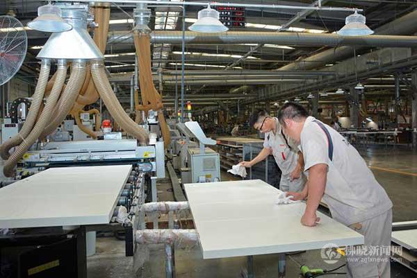 TATA木門(mén)生產(chǎn)線(xiàn)上一派繁忙景象。記者 王明輝 攝