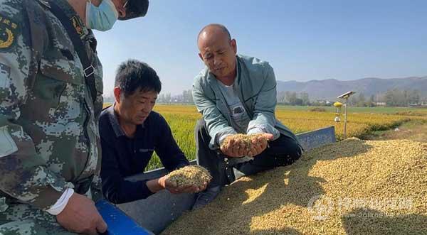 不遠(yuǎn)處,收割機(jī)轟鳴而過(guò),經(jīng)過(guò)脫粒后,金黃色的稻谷不斷從機(jī)艙中傾瀉而出,顆粒飽滿、香氣撲鼻。“這200畝水稻是我們村集體種植的,今天開(kāi)鐮,預(yù)計(jì)三四天能收完?!贝寮?jí)水稻示范田管理負(fù)責(zé)人孔衛(wèi)東一邊指揮幾輛農(nóng)用三輪車排隊(duì)裝貨,一邊對(duì)記者說(shuō),“我們的香稻米是經(jīng)過(guò)山泉水灌溉的,礦物質(zhì)含量豐富,米質(zhì)好,口感軟糯,總之就是一個(gè)字‘香’。”
