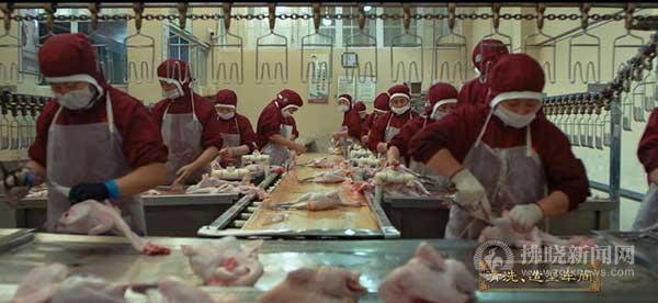 徽香源燒雞廠清洗、造型車間工人在清理食材。