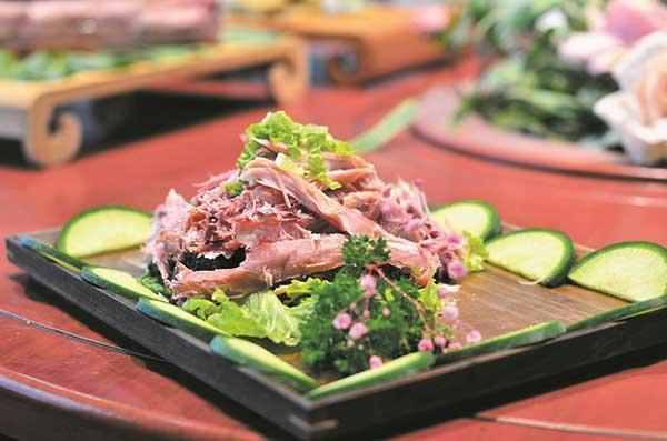 埇橋烤鴨制作食材選用本地改良填鴨,經(jīng)過宰殺、清洗、打氣、批蜜汁等數(shù)十道工序,再佐以精選八角、花椒、當(dāng)歸等20余種中藥材腌制24小時(shí)以上,再晾干,然后進(jìn)入2米多高的烤爐烤制,先小火煨烤,再大火脆烘出爐,再由片鴨師傅精湛的刀工片108片擺盤上桌。