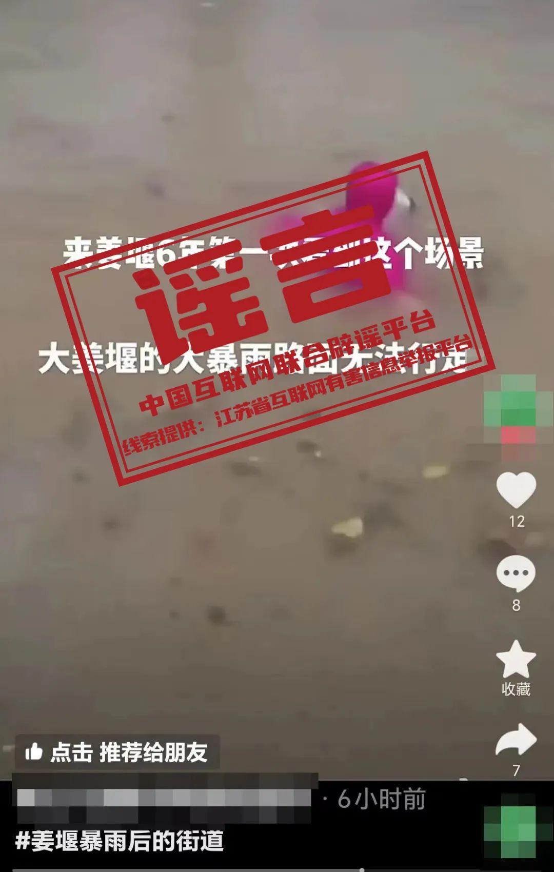 真相:近日,有網(wǎng)民在社交賬號上發(fā)布暴雨視頻,并配文稱“來姜堰6年第一次看到這個(gè)場景,大姜堰的大暴雨路面無法行走”,造成不良社會影響。經(jīng)江蘇省泰州市姜堰區(qū)警方查實(shí),該視頻為趙某為博取眼球、吸粉增流,罔顧事實(shí)從網(wǎng)上下載外地洪水視頻后配文發(fā)布。目前警方已對違法行為人趙某依法予以行政處罰,趙某已主動(dòng)將視頻刪除。(來源:江蘇省互聯(lián)網(wǎng)違法和有害不良信息舉報(bào)中心、“平安泰州”微信公眾號)