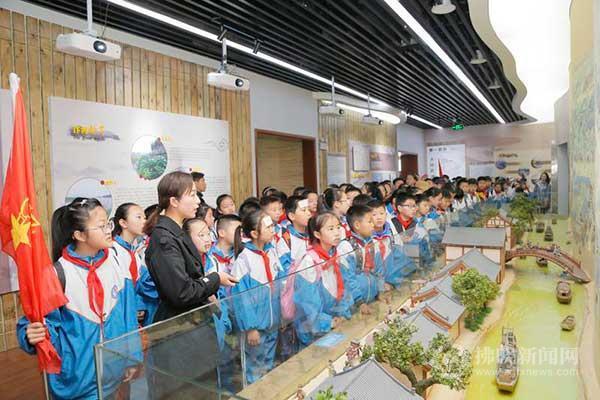 一群小學(xué)生在宿州市汴河博物館參觀研學(xué)。