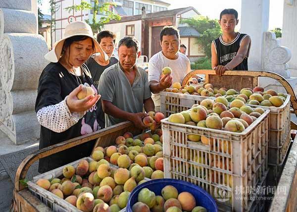 浙江客商(左一)在碭城鎮(zhèn)西南門村收購鮮桃。