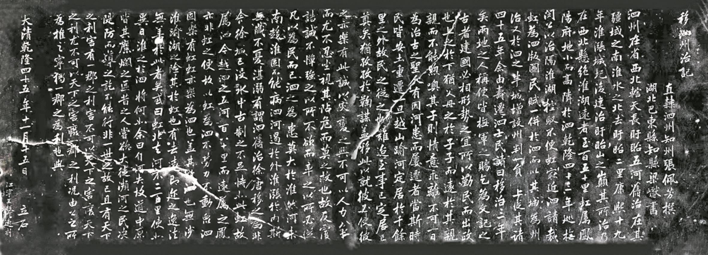 《移泗州治記》碑于清乾隆四十五年(1780年)刻。碑文由清朝直隸泗州知州張佩芳撰,清代著名書法家、湖北巴東縣知縣梁巘書。碑文不僅記載了安徽巡撫閔鄂元上疏奏請裁虹并泗、泗州移虹前后的歷史事件,還具有很高的書法藝術(shù)欣賞和研究價值。