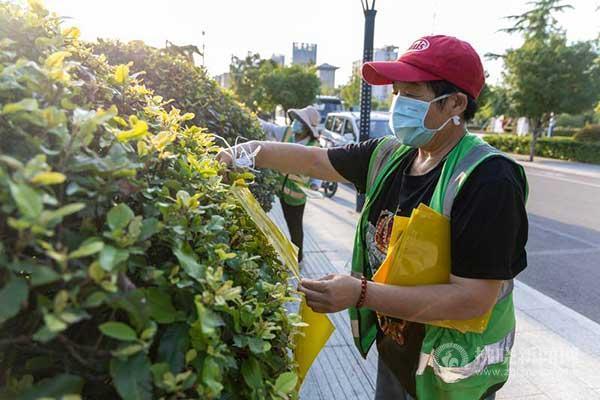 9月22日,市園林管理服務(wù)中心工作人員在市銀河廣場懸掛黃色誘蟲板。針對近期小白蛾隨處可見的現(xiàn)象,市園林管理服務(wù)中心采取多項(xiàng)措施,對城區(qū)綠化帶、行道樹進(jìn)行集中防治作業(yè),以減少小白蛾傳染源頭數(shù)量。記者 董木子 攝