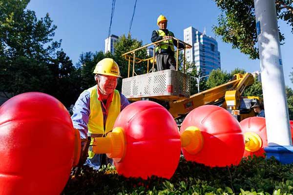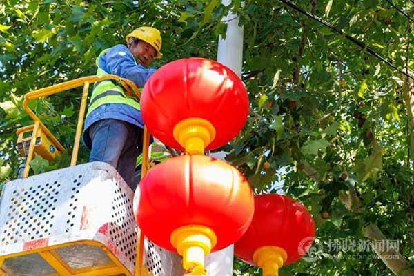 9月24日,市政工程管理處工作人員在宿城淮河中路懸掛紅燈籠,迎接國慶節(jié)的到來。連日來,宿城主次干道陸續(xù)掛起大紅燈籠,洋溢著喜慶的節(jié)日氣氛。 記者 蔣幫煜 攝