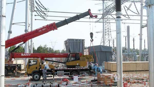 在500千伏埇橋變電站擴(kuò)建施工現(xiàn)場,工作人員使用吊車安裝設(shè)備。