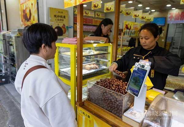 小店門口,一位帶著孩子的寶媽買了一份剛出鍋的板栗,當(dāng)場剝了一粒給孩子。這位寶媽說:“板栗熱乎乎的時候最好吃,這里的板栗甜甜的,軟軟的,口感很不錯。”