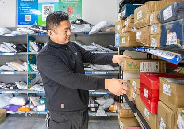 10月31日,在宿城農(nóng)科路一快遞驛站,工作人員正在整理快遞。 記者 董木子 攝