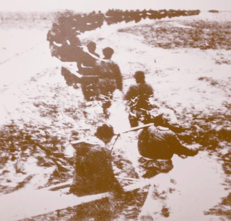 在淮海戰(zhàn)役第三階段,連降雨雪,天寒地凍,車輛難行,為及時(shí)把碭山車站積壓的物資轉(zhuǎn)運(yùn)到前線,中共碭南縣委書記魯禹道扛起面袋,踏著積雪走在前面,黨員干部緊隨其后,組成1.58萬(wàn)人的隊(duì)伍,擔(dān)挑肩扛將1430萬(wàn)斤米面送到前線。