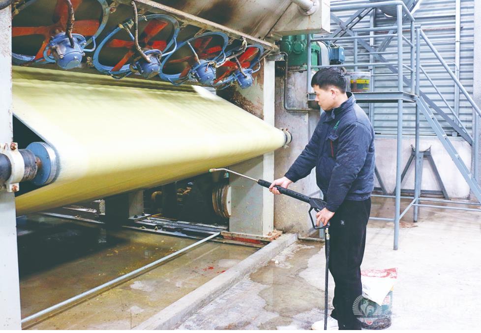 宿州中農(nóng)秸美科技有限公司纖維干燥車間內(nèi),工人正在沖洗紙機毛布。