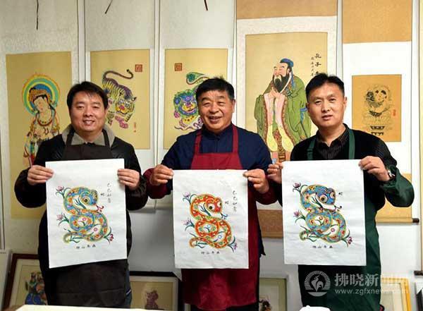 “碭山年畫”省級非遺代表性傳承人黃興橋(中)創(chuàng)作的蛇年年畫。