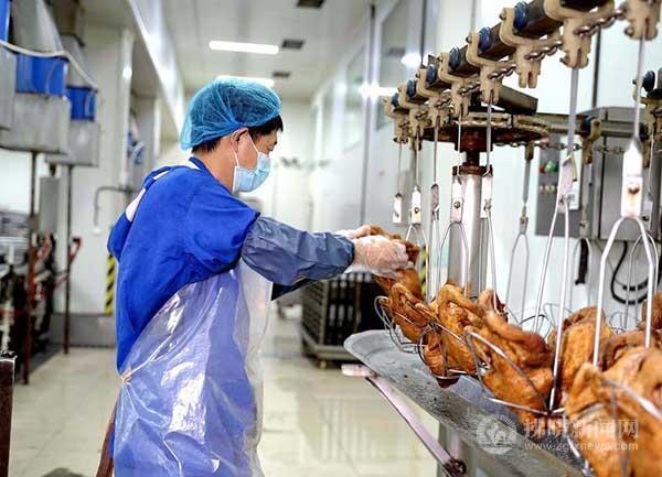 在燒雞的生產(chǎn)車間里,一條條現(xiàn)代化的生產(chǎn)線井然有序地運轉(zhuǎn)著。從活雞宰殺、清洗、整形,到涂抹飴糖、油炸、鹵制,每一道工序都實現(xiàn)了自動化操作。