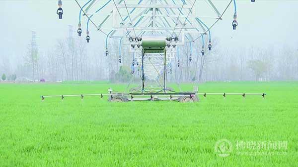 埇橋區(qū)灰古鎮(zhèn)高標(biāo)準(zhǔn)農(nóng)田里,平行行走式水肥藥一體機正在噴灑水肥和農(nóng)藥。