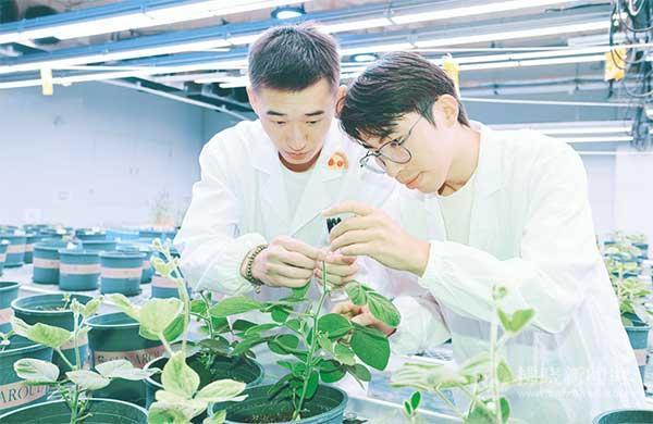 研究人員在南京農(nóng)業(yè)大學(xué)大豆生物育種中心人工氣候室察看大豆長(zhǎng)勢(shì)。