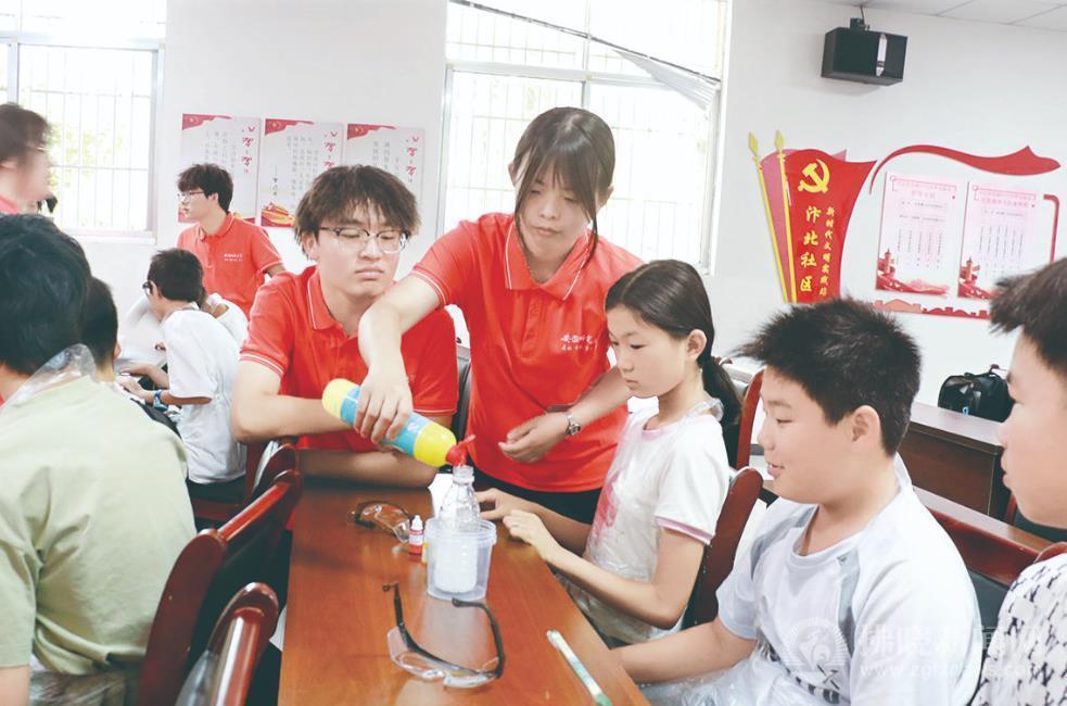 在埇橋區(qū)汴河街道汴北社區(qū),來自安徽師范大學(xué)化材學(xué)院小津花志愿服務(wù)團的志愿者們在暑期公益課堂上做科普實驗。