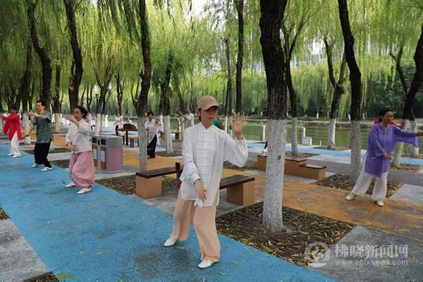 7月25日晨,市民在宿城沱河公園打太極拳。