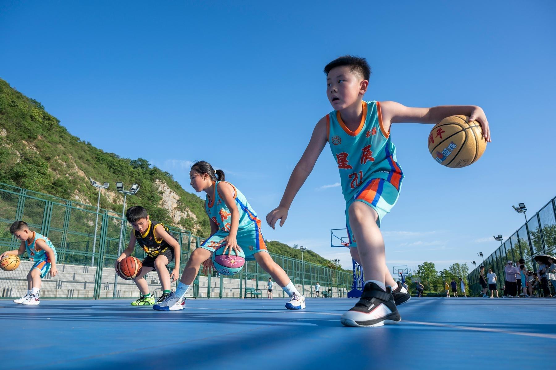 8月7日,蕪湖市峨山鎮(zhèn),小朋友在體育公園的球場(chǎng)上打籃球。本報(bào)通訊員 肖本祥 攝