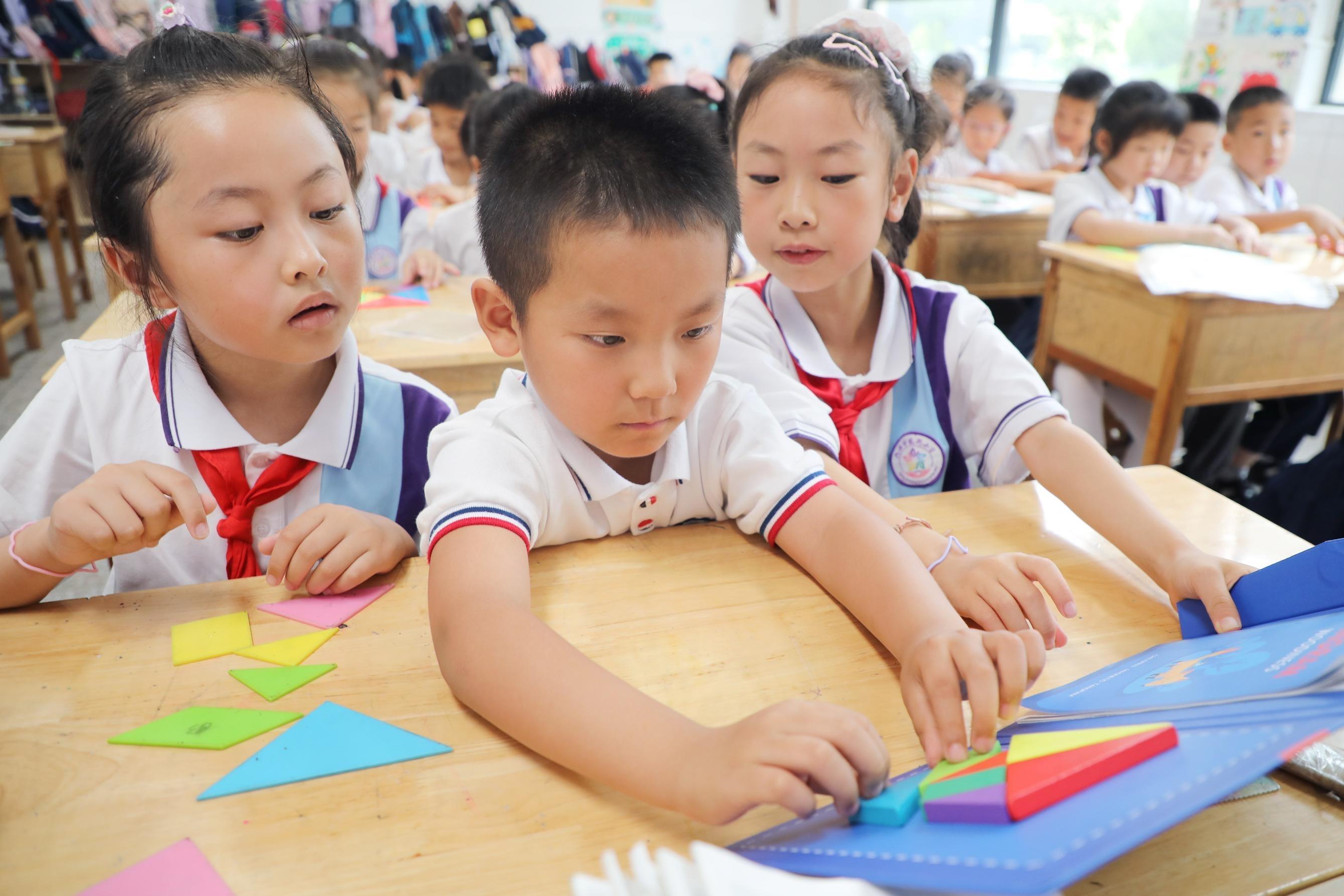 6月12日,六安市裕安區(qū)紫荊小學(xué),小朋友在課堂上學(xué)拼七巧板。本報(bào)通訊員 田凱平 攝