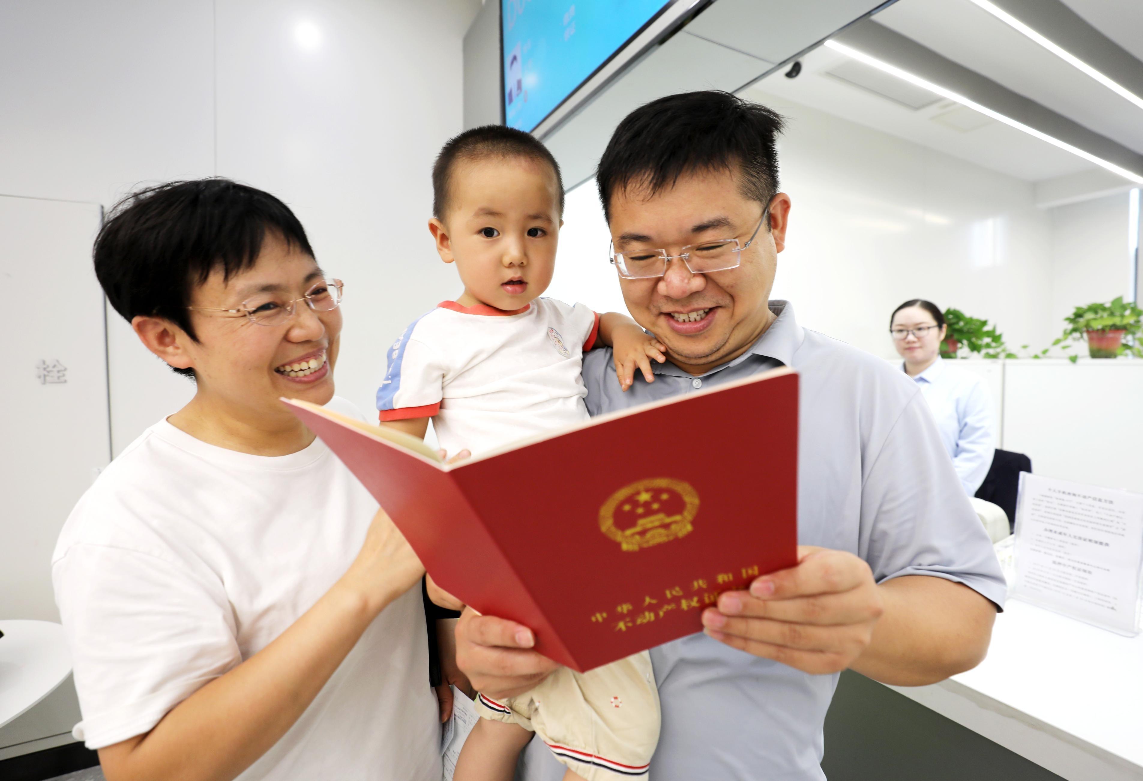 8月15日,在淮北市相山區(qū)政務(wù)中心不動(dòng)產(chǎn)登記入學(xué)“綠色通道”,為孩子報(bào)名的陳先生一家拿到了剛剛辦理的產(chǎn)權(quán)證書。本報(bào)通訊員 李鑫 攝
