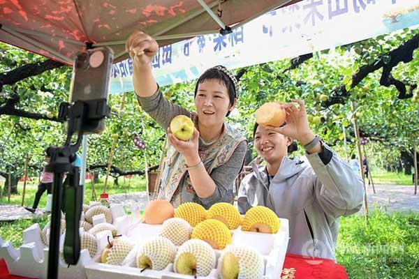 碭山采梨節(jié)活動(dòng)上,梨農(nóng)張雪芝(左)通過(guò)視頻直播的方式銷(xiāo)售酥梨。特約攝影 崔猛