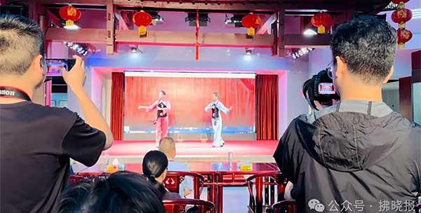 采風(fēng)團(tuán)記者觀看泗州戲演出并拍攝記錄