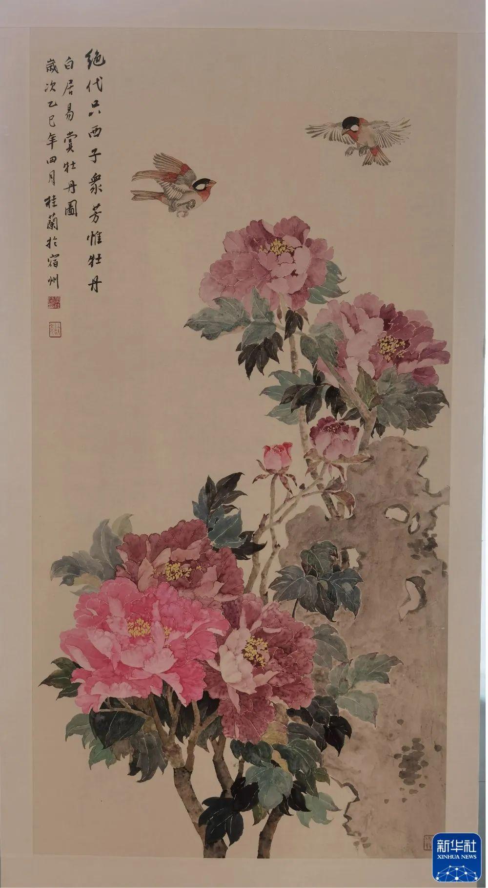 參展國畫作品《白居易賞牡丹圖》,作者李桂蘭。新華社客戶端發(fā)(詹燕南 攝)