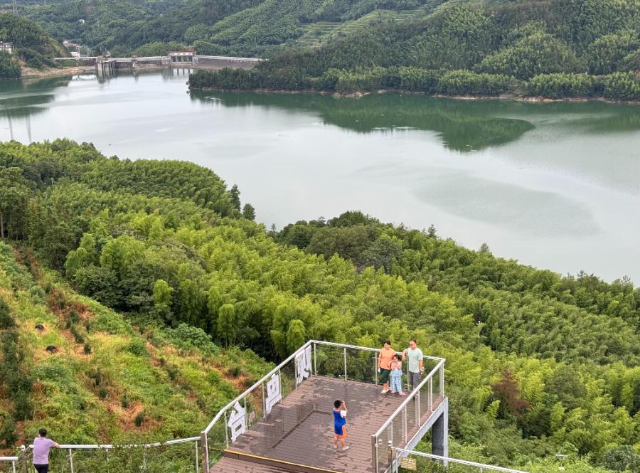 游客在廣福村觀鳥臺(tái)上合影留念,遠(yuǎn)處是釣魚臺(tái)水庫(kù)。新華網(wǎng) 吳京澤 攝