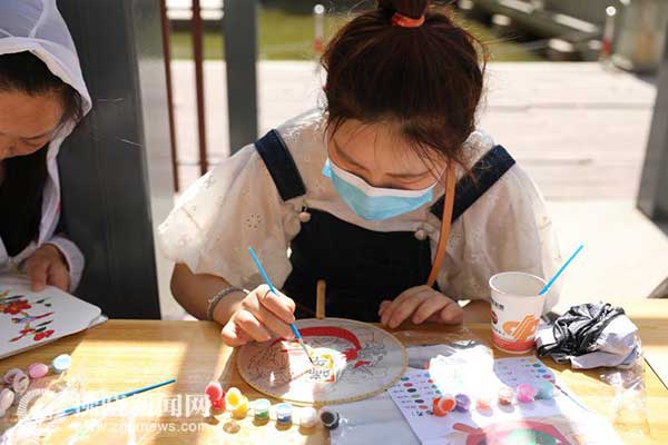 6月2日,在埇橋區(qū)三八街道金園社區(qū)小廣場,市民正認真畫團扇。 劉寧剛 攝