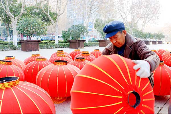 工人師傅在整理燈籠準(zhǔn)備懸掛。 特約攝影 丁輝